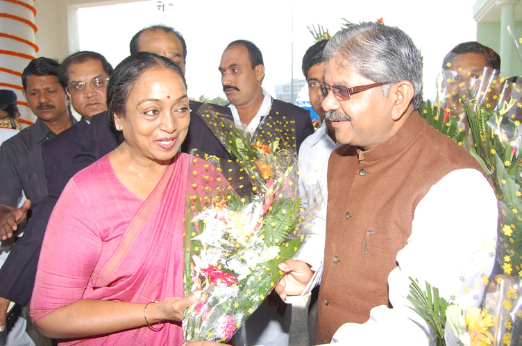 लोकसभा अध्यक्ष श्रीमती मीरा कुमार के विधान सभा भवन पहुँचने पर विधान सभा अध्यक्ष श्री धरम लाल कौशिक ने उनका पुष्प गुच्छ देकर स्वागत किया. |