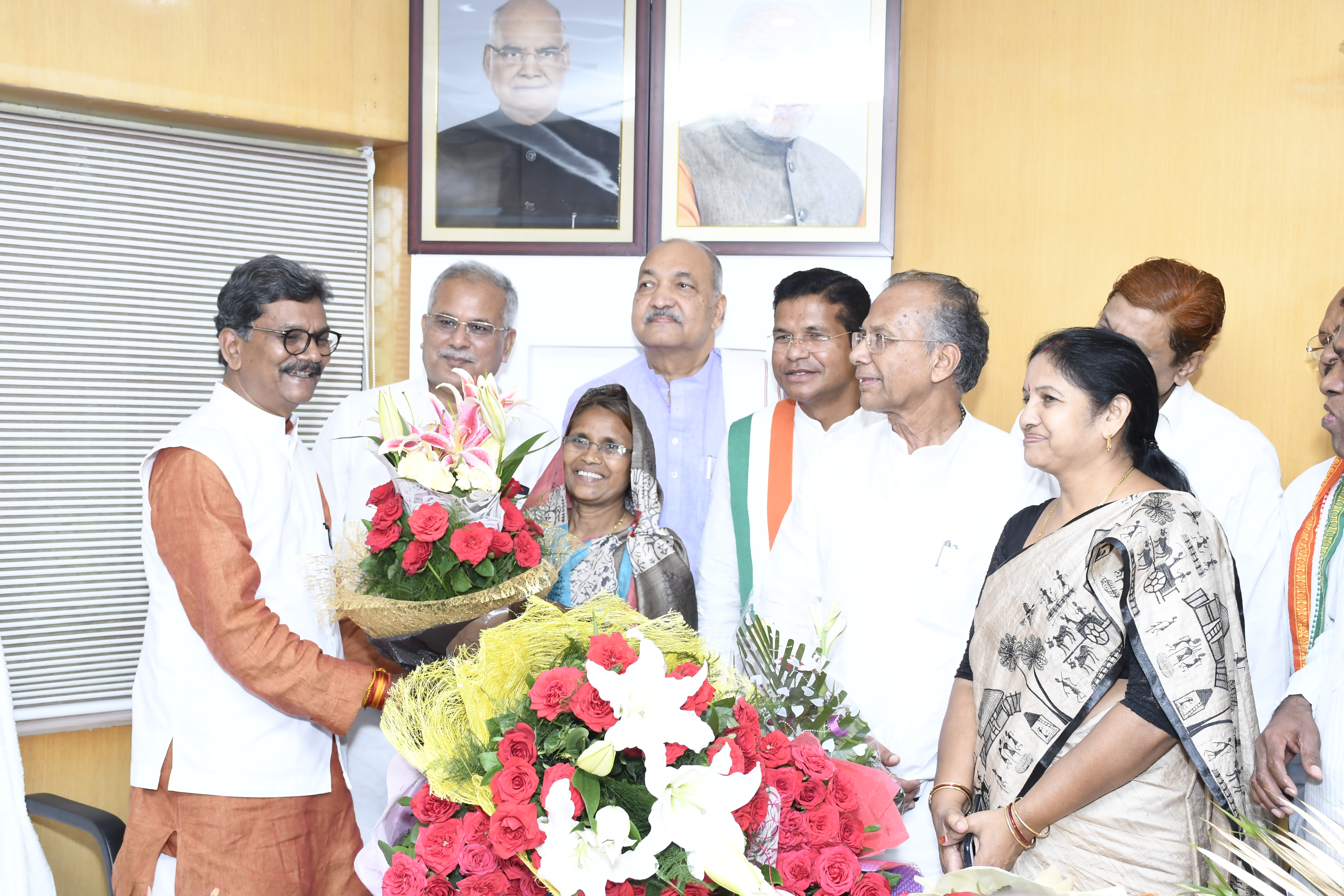 छत्तीसगढ़ विधानसभा के लिए दन्तेवाड़ा क्षेत्र से नव निर्वाचित विधायक मान. श्रीमती देवती कर्मा को विधान सभा अध्यक्ष डॉ. चरणदास महंत ने आज अपराह्न 1.00 बजे विधान सभा परिसर स्थित अपने कक्ष में शपथ दिलाई। मान. श्रीमती देवती कर्मा ने ईश्वर के नाम पर हिन्दी में शपथ ग्रहण की। इस अवसर पर मान. मुख्यमंत्री श्री भूपेश बघेल, गृह मंत्री मान. श्री ताम्रध्वज साहू, संसदीय कार्यमंत्री मान. श्री रविन्द्र चौबे, वन मंत्री मान. श्री मोहम्मद अकबर, नेता प्रतिपक्ष मान. श्री धरमलाल कौशिक, राज्यसभा सासंद मान. श्रीमती छाया वर्मा, विधान सभा सचिव श्री चन्द्र शेखर गंगराड़े, मान. विधायकगण, श्रीमती देवती कर्मा के परिवार के सदस्य एवं उनके क्षेत्र के कार्यकर्तागण उपस्थित थे। शपथ ग्रहण के पश्चात् विधान सभा अध्यक्ष मान. डॉ. चरणदास महंत एवं मुख्यमंत्री मान. श्री भूपेश बघेल ने मान. देवती कर्मा को पुष्प-गुच्छ भेंट कर उन्हें बधाई एवं शुभकामनाएं दी।