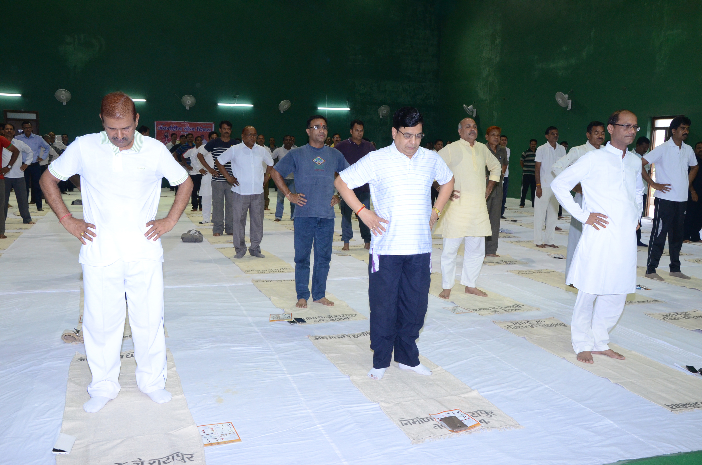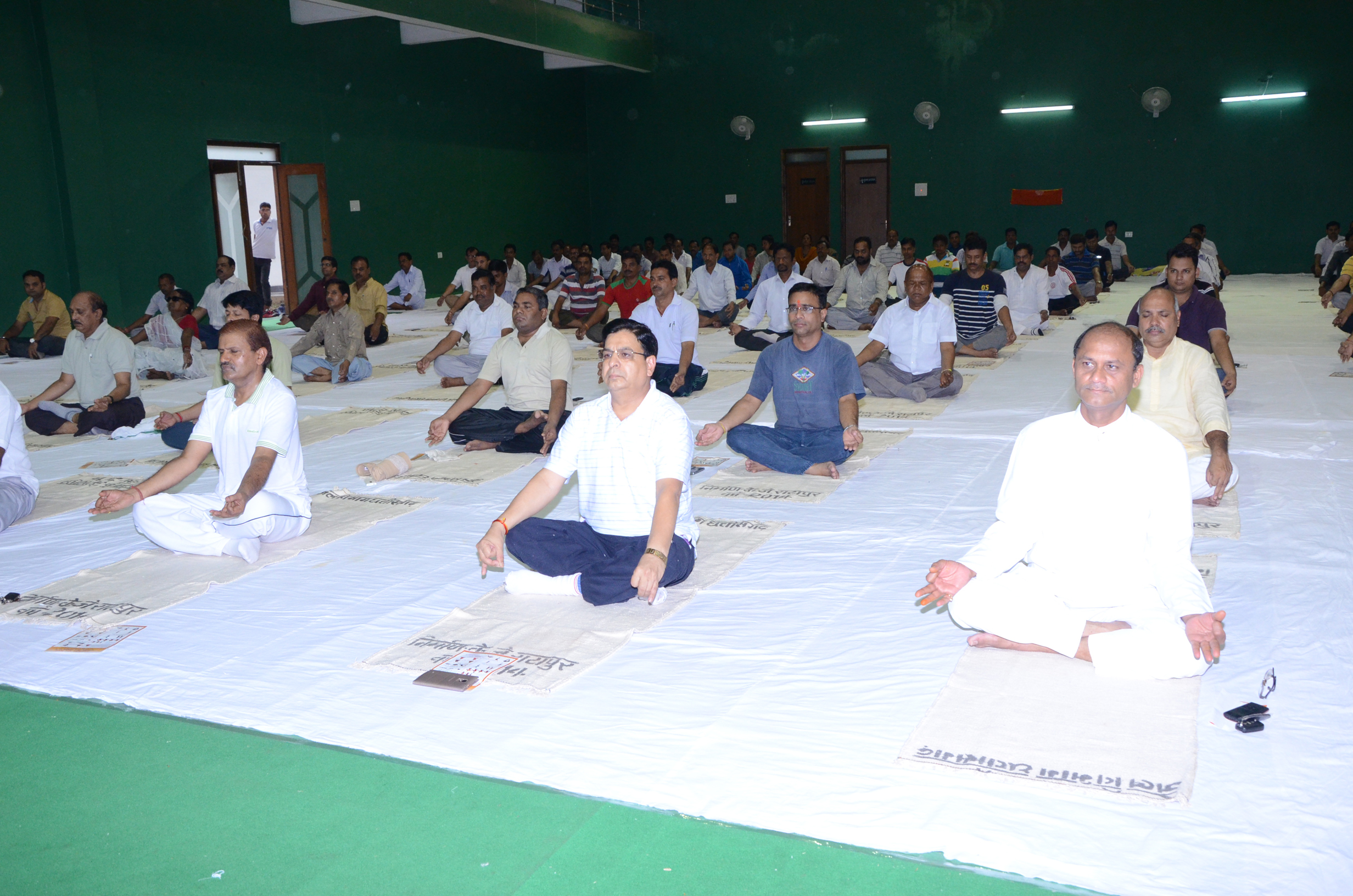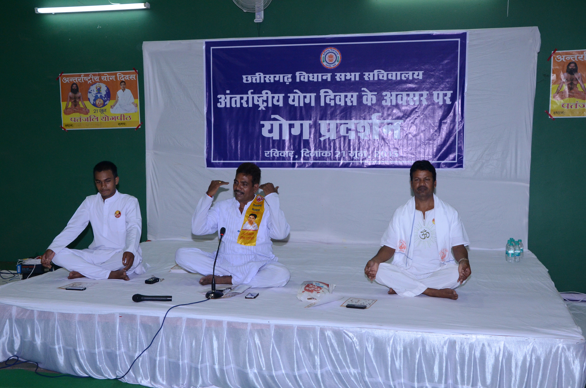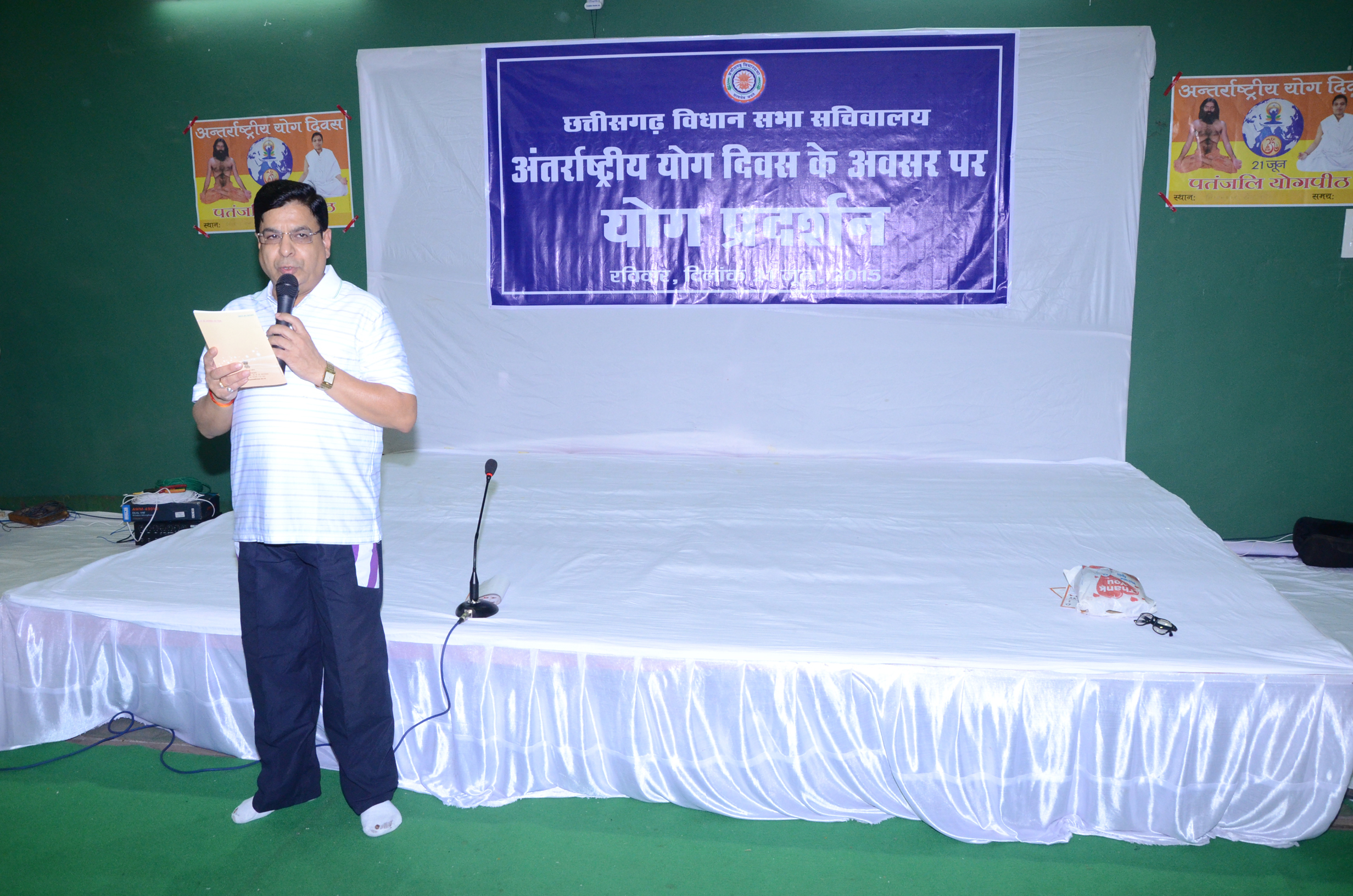 छत्तीसगढ़ विधान सभा सचिवालय में अन्तर्राष्ट्रीय योग दिवस के अवसर पर "सामूहिक योग प्रदर्शन" कार्यक्रम सम्पन्न हुआ। "सामूहिक योग प्रदर्शन" कार्यक्रम के अवसर पर विधान सभा के प्रमुख सचिव श्री देवेन्द्र वर्मा सहित विधान सभा के समस्त अधिकारियों/कर्मचारियों ने इसमें हिस्सा लिया। इस अवसर पर विधान सभा सचिवालय में पदस्थ एलोपैथी, होम्योपैथी चिकित्सक एवं लोक निर्माण विभाग के अधिकारी/कर्मचारी भी बड़ी संख्या में उपस्थित रहें। "सामूहिक योग प्रदर्शन" में पतंजलि योग पीठ, रायपुर के प्रशिक्षकों सर्वश्री छबिराम साहू, जगदीश साहू एवं कृष्णा साहू द्वारा योग प्रदर्शन कराया गया। |