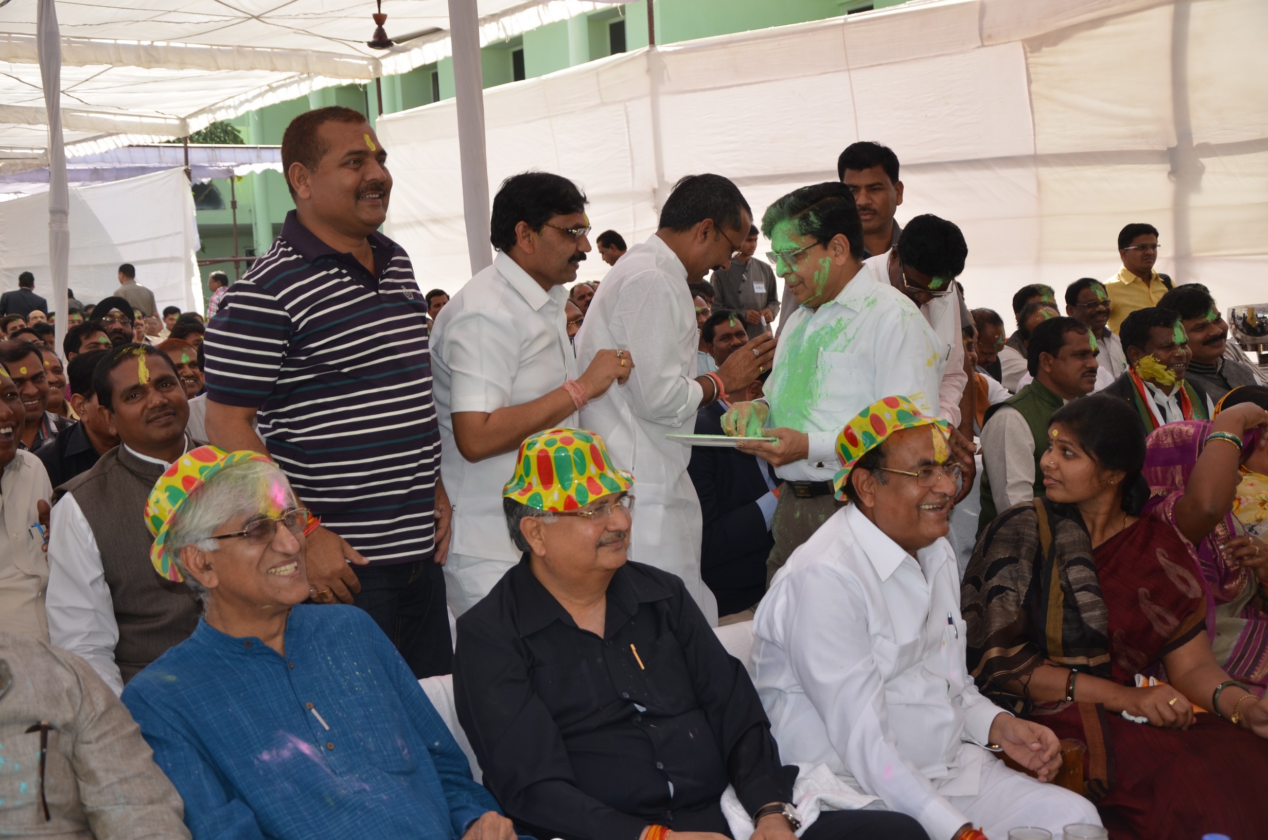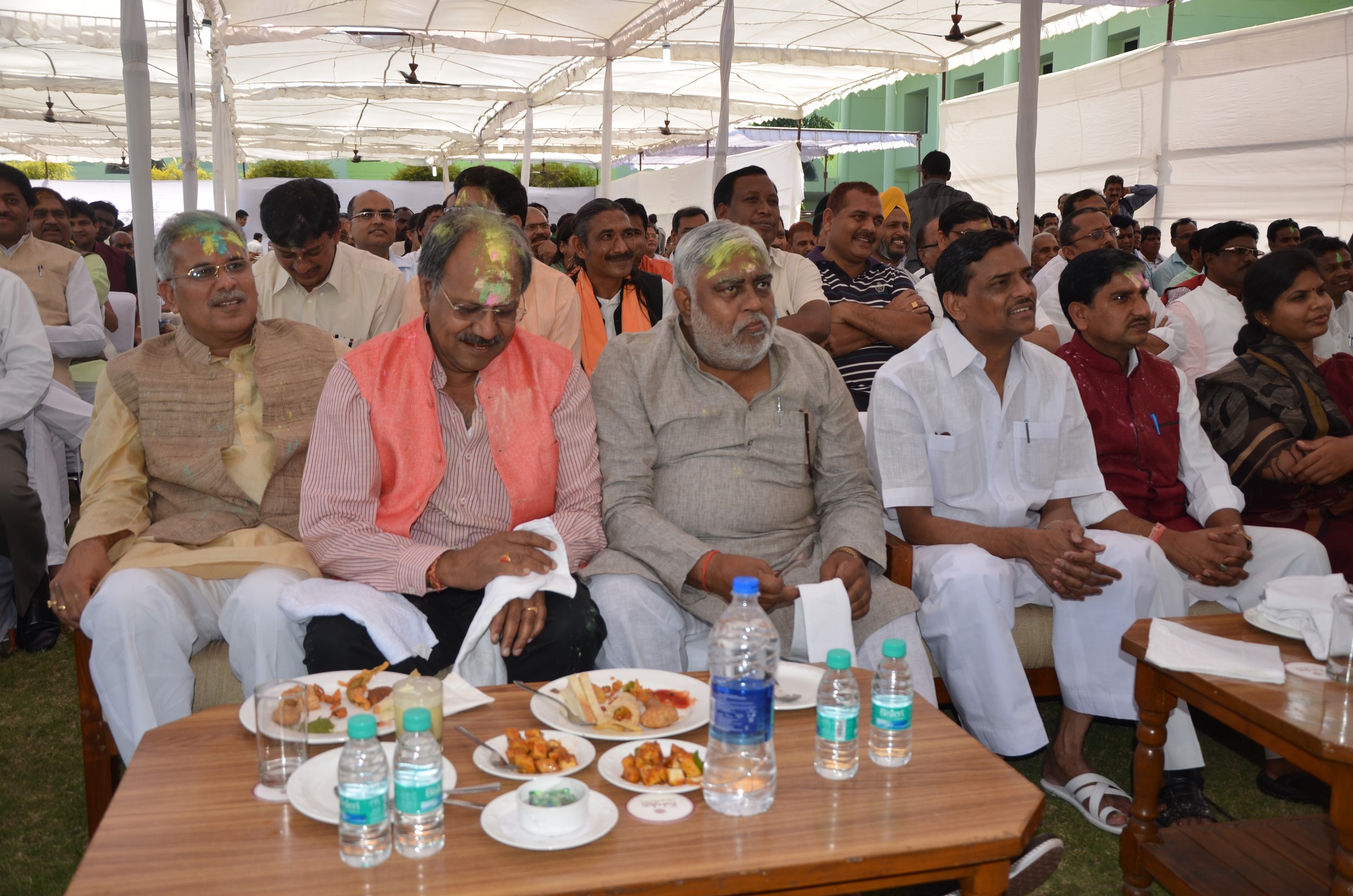(फोटो गैलरी के लिए यहां क्लिक करें) छत्तीसगढ़ विधान सभा परिसर में आज विधायक क्लब छत्तीसगढ़ विधान सभा एवं संस्कृति विभाग, छत्तीसगढ़ शासन के संयुक्त तत्वावधान में "होली मिलन" समारोह का आयोजन किया गया। समारोह में विधान सभा अध्यक्ष श्री गौरीशंकर अग्रवाल, मुख्यमंत्री डॉ. रमन सिंह, मान. मंत्रीगण, मान. सासंद, मान. नेता प्रतिपक्ष श्री टी.एस. सिंहदेव, मान. विधायकगण, मान. पूर्व विधायकगण, मुख्य सचिव श्री विवेक ढांड, विधान सभा के प्रमुख सचिव श्री देवेन्द्र वर्मा, शासन के वरिष्ठ प्रशासनिक अधिकारी गण, मान. पत्रकार गण, प्रबुद्धजन एवं विधानसभा सचिवालय के अधिकारी/कर्मचारी उपस्थित थे। होली मिलन समारोह में विधान सभा अध्यक्ष श्री गौरीशंकर अग्रवाल, मुख्यमंत्री डॉ. रमन सिंह, संसदीय कार्य मंत्री श्री अजय चन्द्राकर, नेता प्रतिपक्ष श्री टी.एस. सिंहदेव ने प्रदेश वासियों को होली की बधाई एवं शुभकामनाएं दी। मान. मंत्रियों, मान. सांसदों, मान. विधायकों, पूर्व विधायकों एवं उपस्थितजनों ने एक दूसरे को रंग एवं गुलाल लगाकर एक दूसरे को होली की बधाई एवं शुभकामनाएं दी। मान. मंत्री श्री बृजमोहन अग्रवाल, नेता प्रतिपक्ष श्री टी.एस. सिंहदेव, प्रदेश कांग्रेस अध्यक्ष श्री भूपेश बघेल, विधायक श्री कवासी लखमा, श्री मोहन मरकाम, डॉ. विमल चोपड़ा, श्री तोखन साहू, श्री रामदयाल उईके सहित सभी मान. विधायक ने होली के उमंग एवं उल्लास में अपने नृत्य एवं गायन के माध्यम से अपनी विभिन्न प्रस्तुतियां दी। उपस्थितजनों पर होली का रंग ऐसा चढ़ा कि सभी झूमने पर मजबूर हो गये। कार्यक्रम के आरंभ में प्रमुख सचिव श्री देवेन्द्र वर्मा ने मान. अध्यक्ष, मान. मुख्यमंत्री डॉ. रमन सिंह, नेता प्रतिपक्ष एवं संसदीय कार्य मंत्री को गुलाल लगाकर होली की शुभकामनाएं दी। पश्चात् समस्त मंत्रियों, विधायकों, पत्रकारों व वरिष्ठ अधिकारियों ने एक दूसरे को गुलाल लगाकर होली की शुभकामनाएं दी। इस अवसर पर कवि श्री सुरेन्द्र दुबे एवं उज्जैन के श्री दिनेश दिग्गज ने हास्य कविताओं के माध्यम से उपस्थितजनों को लोटपोट कर दिया। होली मिलन समारोह के प्रारंभ में संस्कृति विभाग द्वारा आयोजित सांस्कृतिक कार्यक्रमों के तहत् लोक कलाकारों द्वारा नृत्य एवं गायन के माध्यम से रंगारंग प्रस्तुति दी गयी। |