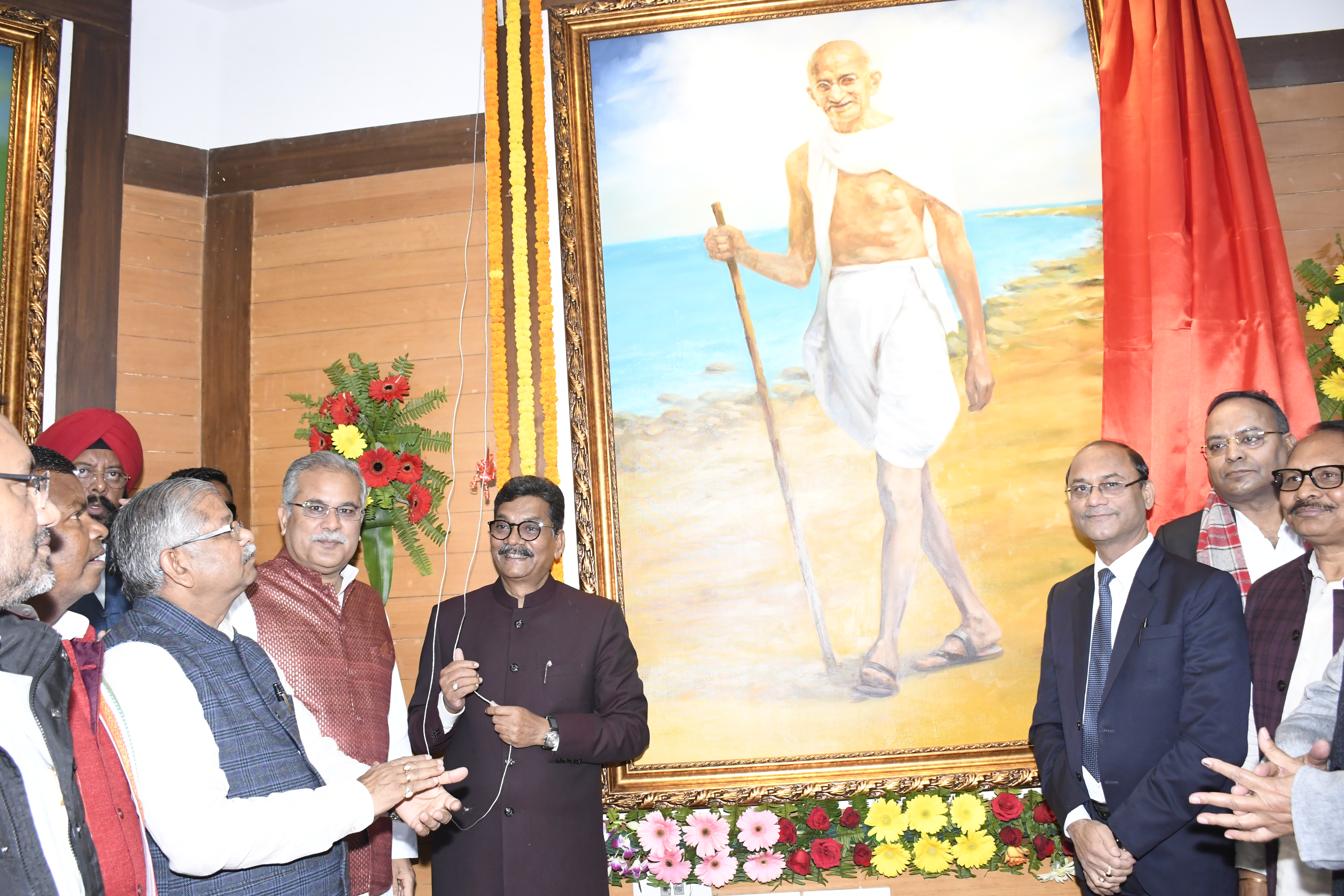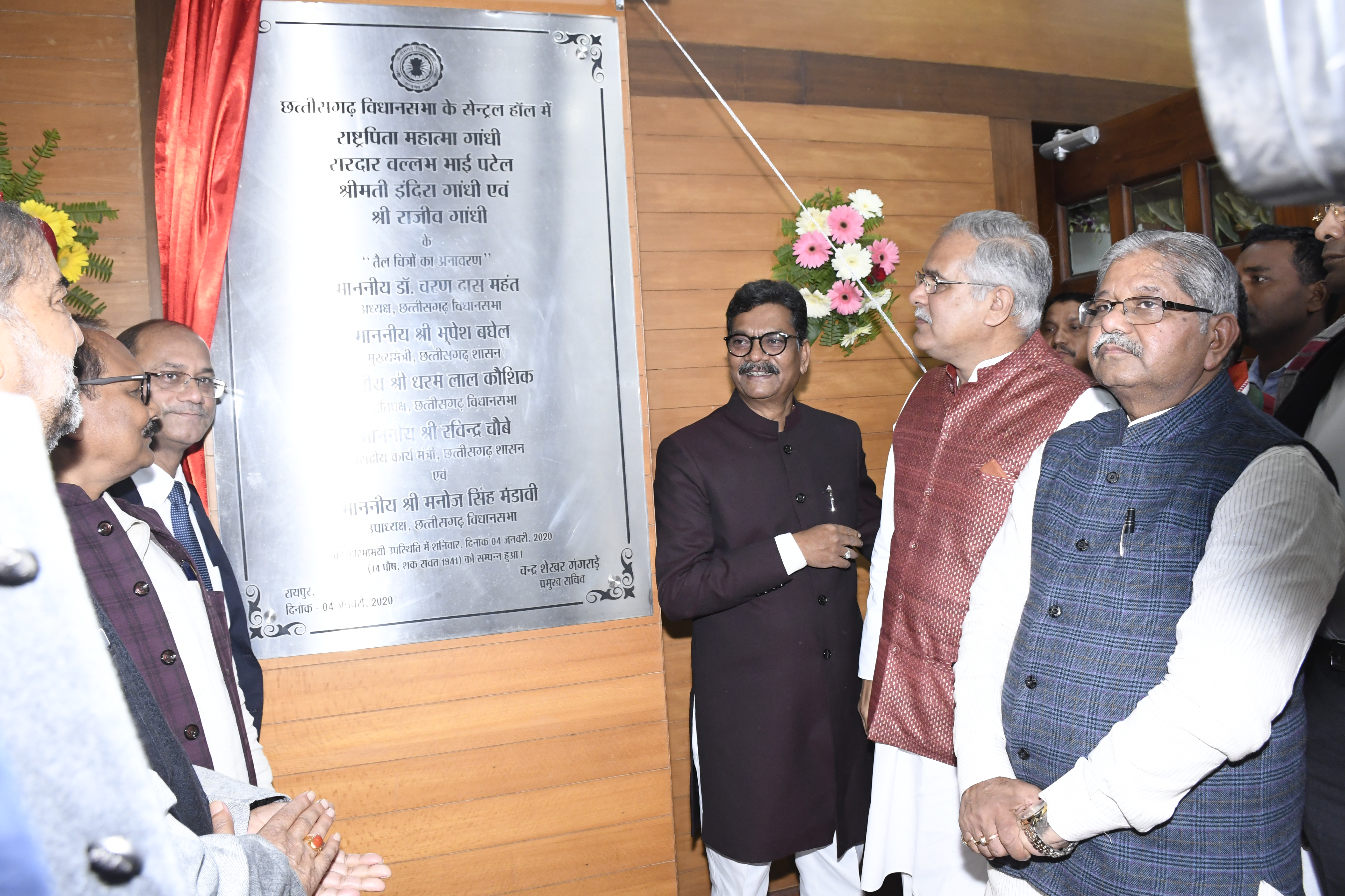छत्तीसगढ़ विधान सभा स्थित सेन्ट्रल हाॅल में आयोजित एक गरिमामय कार्यक्रम में आज पूर्वान्हः 10.30 बजे राष्ट्रपिता महात्मा गांधी, सरदार वल्लभ भाई पटेल, श्रीमती इंदिरा गांधी एवं श्री राजीव गांधी के विशालकाय तैल चित्रों का अनावरण विधान सभा अध्यक्ष मान. डॉ. चरणदास महंत, मान. मुख्यमंत्री श्री भूपेश बघेल एवं मान. नेता प्रतिपक्ष श्री धरमलाल कौशिक ने किया । इस अवसर पर मान. शिक्षा मंत्री डॉ.. प्रेमसाय सिंह टेकाम, मान. वाणिज्य एवं उद्योग मंत्री श्री कवासी लखमा, मान. लोक स्वास्थ्य यांत्रिकी विभाग मंत्री श्री गुरू रूद्र कुमार, मान. विधायक गण एवं विधान सभा के प्रमुख सचिव श्री चन्द्र शेखर गंगराडे़ उपस्थित थे ।