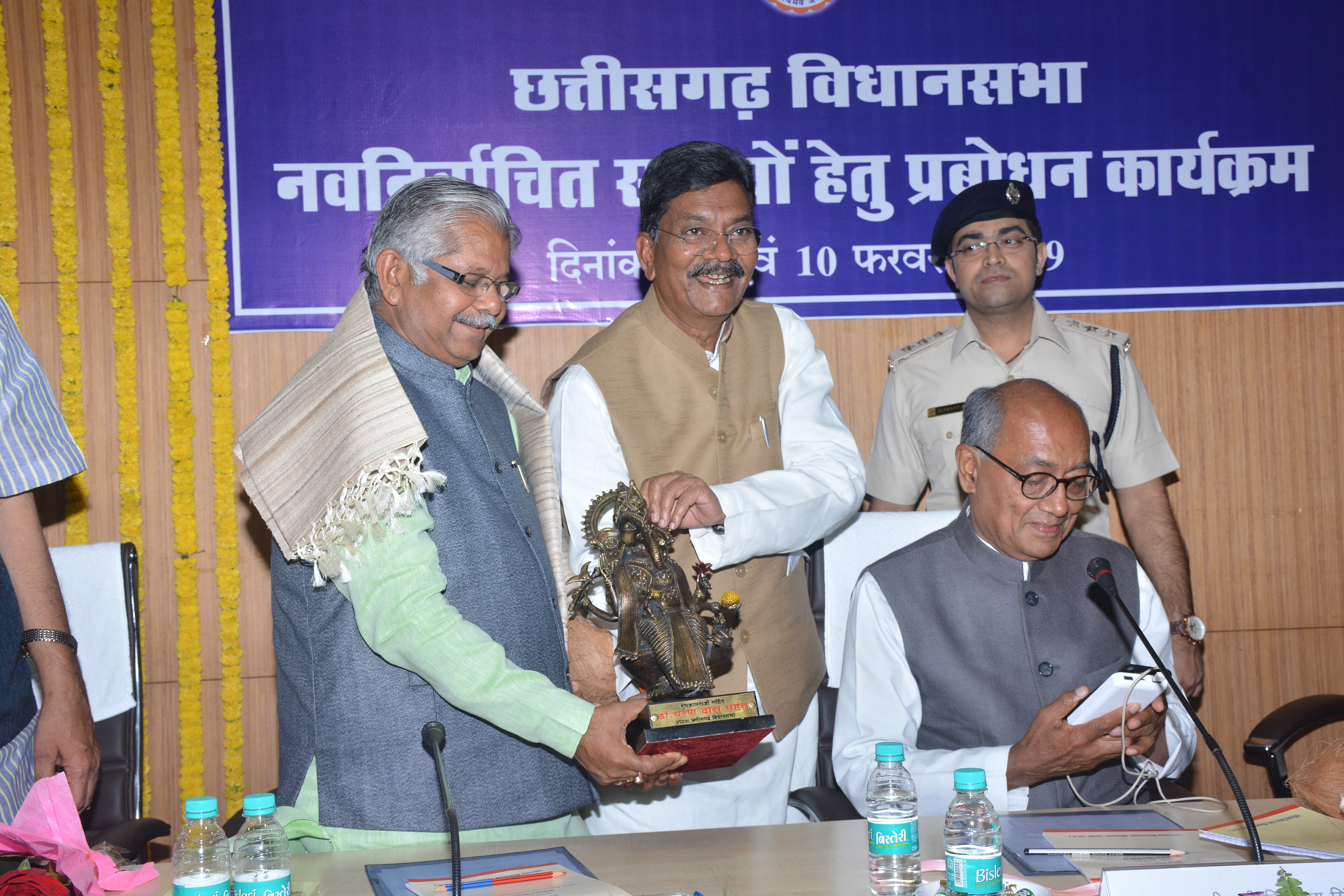छत्तीसगढ़ विधान सभा सचिवालय में नवनिर्वाचित मान. सदस्यों के लिए आयोजित प्रबोधन कार्यक्रम के समापन सत्र में आज राज्यसभा सांसद एवं पूर्व मुख्यमंत्री, मध्य प्रदेश, मान. श्री दिग्विजय सिंह ने सदस्यों को सम्बोधित किया। उन्होने अपने सुदीर्घ राजनैतिक जीवन के अनुभवों को मान. सदस्यों को बताया एवं उन्हें सफल एवं प्रभावी विधायक बनने के गुर बताये। इस अवसर पर विधान सभा अध्यक्ष मान. डॉ. चरणदास महंत, मान. मुख्यमंत्री श्री भूपेश बघेल, नेता प्रतिपक्ष मान. श्री धरमलाल कौशिक, संसदीय कार्यमंत्री मान. श्री रविन्द्र चौबे, स्कूल शिक्षा मंत्री डॉ. प्रेमसाय सिंह टेकाम, श्रीमती अमृता राय, मान. मंत्रीगण, मान. सदस्यगण एवं विधान सभा के सचिव, श्री चन्द्र शेखर गंगराडे़ उपस्थित थे। राज्यसभा सांसद एवं पूर्व मुख्यमंत्री, मध्य प्रदेश मान. श्री दिग्विजय सिंह ने सदस्यों को प्रभावी एवं सफल विधायक बनने के गुर बताते हुए कहा कि-क्षेत्र के मतदाता से जीवित संपर्क, नियम प्रक्रियाओं का पूरा ज्ञान, व्यवहार कुशलता, मृदुभाषिता एवं सदन में संयमित भाषा से ही कोई भी मान. सदस्य प्रभावी विधायक के रूप में अपनी पहचान बना सकता है। उन्होंने कहा कि- शोर-शराबा करके विधान सभा के अंदर मान. सदस्य अपनी पहचान नहीं बना सकते। उन्होंने कहा कि- मान. सदस्यों को अपनी विचारधारा से समझौता नहीं करना चाहिए। उन्होंने श्री कवासी लखमा का उदाहरण देते हुए कहा कि- मतदाताओं से जीवित जनसंपर्क से अनपढ़ व्यक्ति सफल एवं प्रभावी विधायक बन सकता है। उन्होंने कहा कि- मान. सदस्यों को अपने विधान सभा क्षेत्र में विरोधियों के प्रति भी अच्छा व्यवहार रखना चाहिए। उन्होंने इस बात पर चिंता व्यक्त की कि विधान सभा का सबसे महत्वपूर्ण कार्य कानून बनाना होता है लेकिन उस समय सभा में विधायकों की उपस्थिति सबसे कम होती है। उन्होंने कहा कि- सदस्यों को अपनी बात सभा में पूरे विश्वास एवं प्रमाणिकता के साथ उठानी चाहिए। इसके पूर्व अपने उद्बोधन में विधान सभा अध्यक्ष मान. डॉ. चरणदास महंत ने कहा कि- श्री दिग्विजय सिंह एक अत्यंत ही परिपक्व राजनेता हैं एवं हम सब उन्हें अपना आदर्श मानते हैं। उनका मार्गदर्शन प्राप्त कर ही नवनिर्वाचित मान. सदस्य प्रभावी विधायक के रूप में अपने आप को स्थापित करने में सफल होगें। उन्होंने बताया कि छत्तीसगढ़ की पंचम विधान सभा में 44 विधायक कृषि क्षेत्र से संबंधित हैं। जबकि 19 मान. सदस्य व्यवसायी, 03 वकील, 06 चिकित्सक एवं अन्य सामाजिक कार्यकर्ता हैं। 01 मान. सदस्य मजदूर थे जो पंचम विधान सभा में निर्वाचित होकर आयें हैं। इस तरह छत्तीसगढ़ की पंचम विधान सभा में एक अद्भुत समन्वय दिखाई देता है। प्रबोधन कार्यक्रम के अवसर मान. सदस्यों को सम्बोधित करते हुए मान. मुख्यमंत