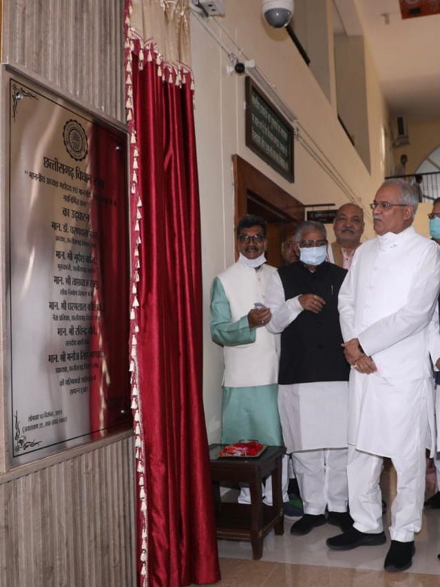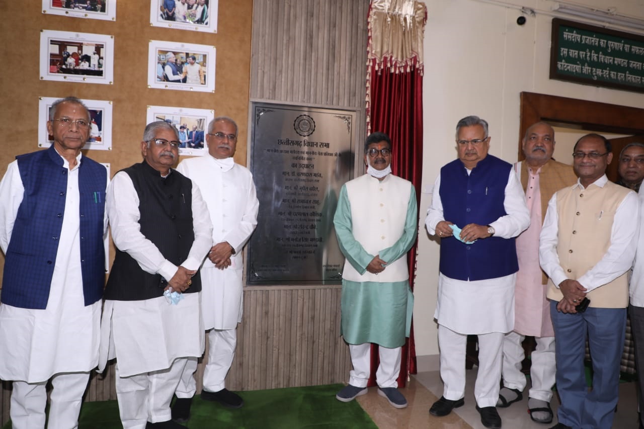 -छत्तीसगढ़ विधान सभा अध्यक्ष डॉ. चरणदास महंत एवं मान. मुख्यमंत्री श्री भूपेश बघेल ने आज विधानसभा परिसर में मान. अध्यक्ष एवं मान. नेता प्रतिपक्ष के नव निर्मित कक्ष का उदघाटन किया। इस अवसर पर नेता प्रतिपक्ष श्री धरम लाल कौशिक, गृह एवं लोक निर्माण मंत्री श्री ताम्रध्वज साहू, संसदीय कार्य मंत्री श्री रविन्द्र चौबे एवं विधान सभा के प्रमुख सचिव श्री चंद्र शेखर गंगराड़े भी उपस्थित थे। |
