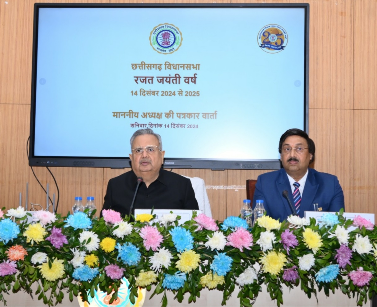 -विधान सभा अध्यक्ष डॉ. रमन सिंह ने विधान सभा परिसर स्थित समिति कक्ष क्रमांक-01 में आज विधान सभा के रजत जयंती वर्ष के “प्रतीक चिन्ह” (LOGO) का विमोचन किया, उन्होंने रजत जयंती वर्ष पर केन्द्रित वीडियो जिसमें छत्तीसगढ़ विधानसभा के प्रारंभ से अभी तक के संसदीय सफर को चित्रित किया गया है, का विमोचन भी किया, जिसे विधान सभा की वेबसाइट पर अपलोड किया गया, जिससे आम जन भी उसे वेबसाइट पर देख सकें। इस अवसर पर विधानसभा सचिव श्री दिनेश शर्मा, विधान सभा सचिवालय के वरिष्ठ अधिकारी एवं कर्मचारी एवं मीडिया प्रतिनिधि भी उपस्थित थे। डॉ. रमन सिंह ने अपनी पत्रकार वार्ता में विधान सभा के रजत जयंती वर्ष दिनांक 14 दिसम्बर, 2024 से 14 दिसम्बर, 2025 तक आयोजित किये जाने वाले प्रस्तावित कार्यक्रम के बारे में भी विस्तार से जानकारी दी। विधानसभा अध्यक्ष डॉ. रमन सिंह ने 16 से 20 दिसम्बर, 2024 तक प्रस्तावित सत्र के लिए सदन में होने वाले प्रस्तावित कार्य की रूप रेखा भी मीडिया प्रतिनिधियों के समक्ष प्रस्तुत की। |