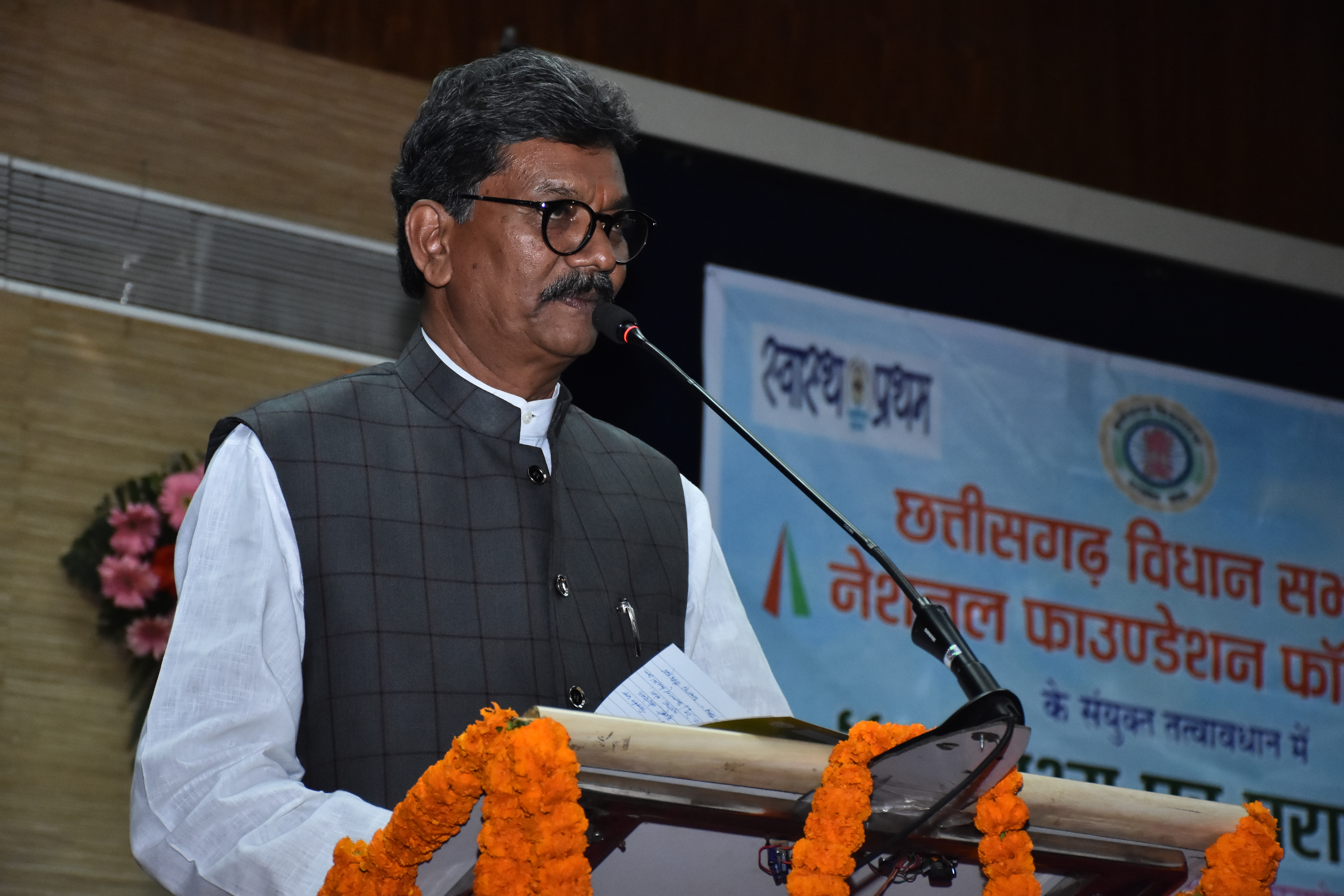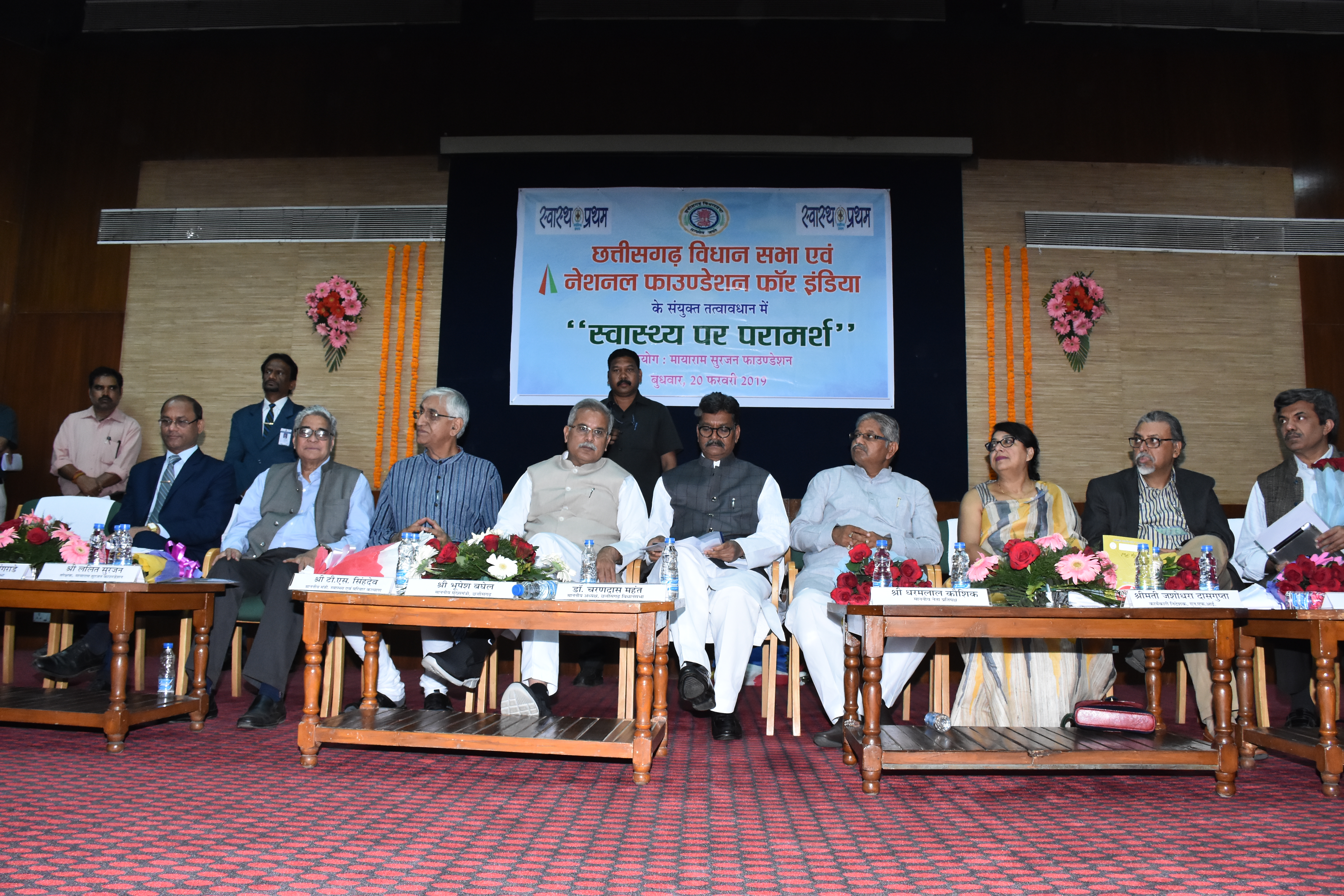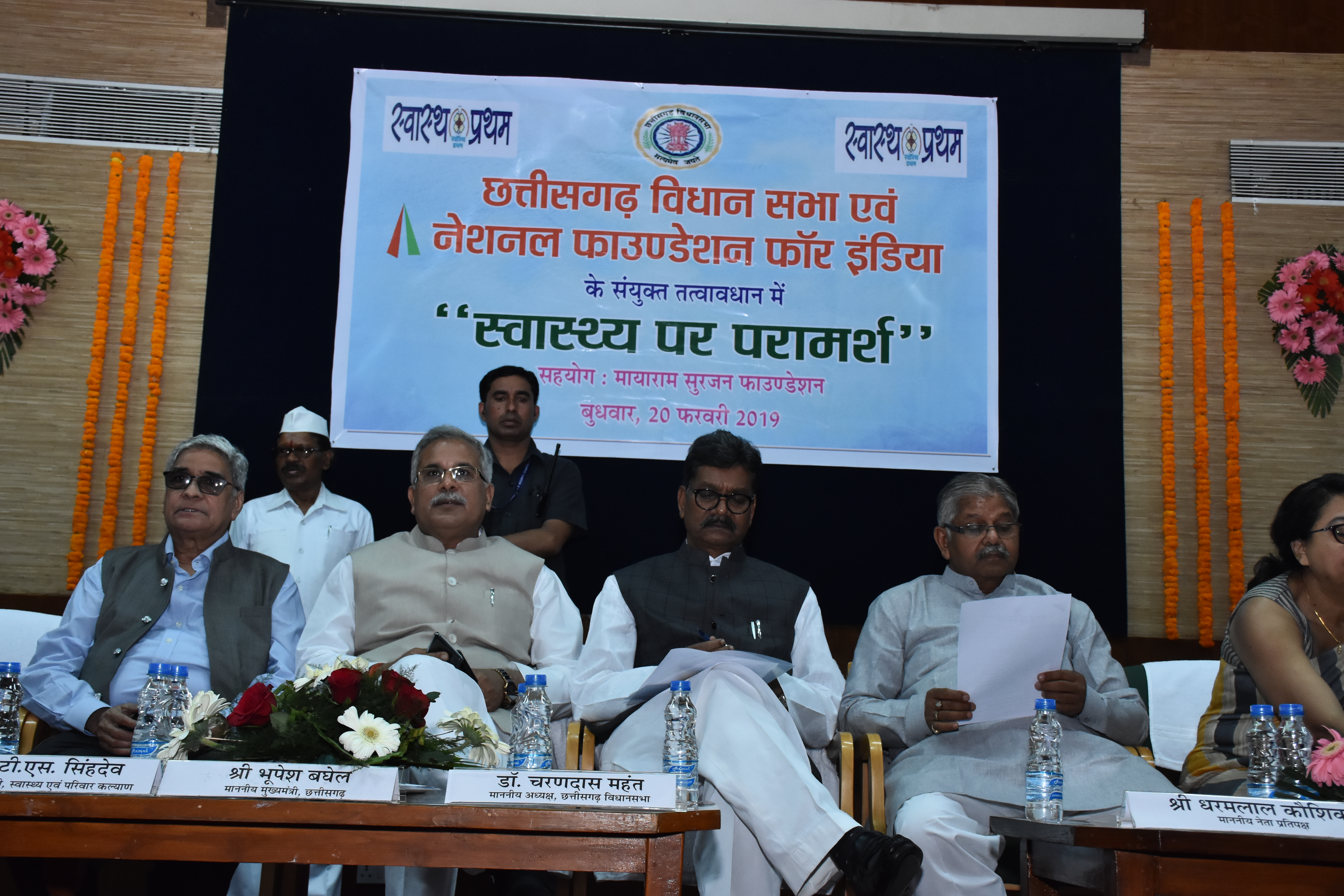 छत्तीसगढ़ विधान सभा एवं नेशनल फाउण्डेशन फॉर इंडिया के सयुंक्त तत्वावधान में आज विधान सभा परिसर स्थित प्रेक्षागृह में मान. सदस्यों के लिए "स्वास्थ्य विषय पर परामर्श कार्यक्रम’’ का आयोजन किया गया। कार्यक्रम में विधान सभा अध्यक्ष मान. डॉ. चरणदास महंत, मान. मुख्यमंत्री श्री भूपेश बघेल, नेता प्रतिपक्ष मान. श्री धरमलाल कौशिक, स्वास्थ्य मंत्री मान. श्री टी.एस.सिंहदेव, मंत्रिपरिषद के मान. सदस्यगण, मान. विधायक गण, विधान सभा सचिव श्री चन्द्र शेखर गंगराडे़, नेशनल फाउण्डेशन फॉर इंडिया की कार्यकारी निदेशक श्रीमती यशोधरा दास गुप्ता एवं कार्यक्रम के संरक्षक श्री ललित सुरजन उपस्थित थे। कार्यक्रम की महत्ता पर प्रकाश डालते हुए विधान सभा अध्यक्ष मान. डॉ. चरणदास महंत ने कहा कि- आज के समय में स्वास्थ्य के प्रति जागरूकता लाने में नेशनल फाउण्डेशन फॉर इंडिया द्वारा जो प्रयास किये जा रहे हैं वह सराहनीय हैं। प्रदेश से मातृ एवं शिशु मत्यु-दर को नवाचार के माध्यम से लगातार कम करने के राज्य सरकार के प्रयास को जन प्रतिनिधियों के माध्यम से लगातार व्यापक किया जाना चाहिए। उन्होंने कहा कि- "पहला सुख निरोगी काया’’ है। "स्वस्थ तन में ही स्वस्थ मन का निवास होता है’’, इसलिए जन प्रतिनिधियों द्वारा इलाज के बेहतर प्रबंधन के साथ-साथ समाज में पहले जागरूकता लाने का निरंतर प्रयास किया जाना चाहिए। इस अवसर पर मान. मुख्यमंत्री श्री भूपेश बघेल ने कहा कि- यह योजना स्वास्थ्य के क्षेत्र में अत्यंत महत्वपूर्ण हैं। उन्होंने कहा कि- हमारे समाज एवं परिवेश में अधिकांश बीमारियां जल से जुड़ी हुई होती हैं। आज के ग्रामीण-जन बीमारियों को अपनी नियति मान लेते हैं जबकि इसकी मुख्य वजह स्वास्थ्य के प्रति हमारी जागरूकता का अभाव है। स्वास्थ्य के क्षेत्र में हमारी चुनौतियों को हम जनजागरण एवं समाज में सभी के सहयोग से बेहतर बना सकते हैं। नेता प्रतिपक्ष मान. श्री धरमलाल कौशिक ने कहा कि- इस तरह के जागरूकता अभियान एवं जानकारियों के आदान-प्रदान से जनप्रतिनिधि अपनी भूमिका का निर्वहन बेहतर तरीके से कर सकते हैं। इस अवसर पर अपने उद्बोधन में स्वास्थ्य मंत्री मान. श्री टी.एस.सिंहदेव ने कहा कि- इस मंच के माध्यम से पंचायत स्तर पर स्वास्थ्य सुविधाओं को बेहतर बनाने के लिए जनप्रतिनिधियों के साथ विचार-विमर्श किया जाना चाहिए। कार्यक्रम में डॉ.