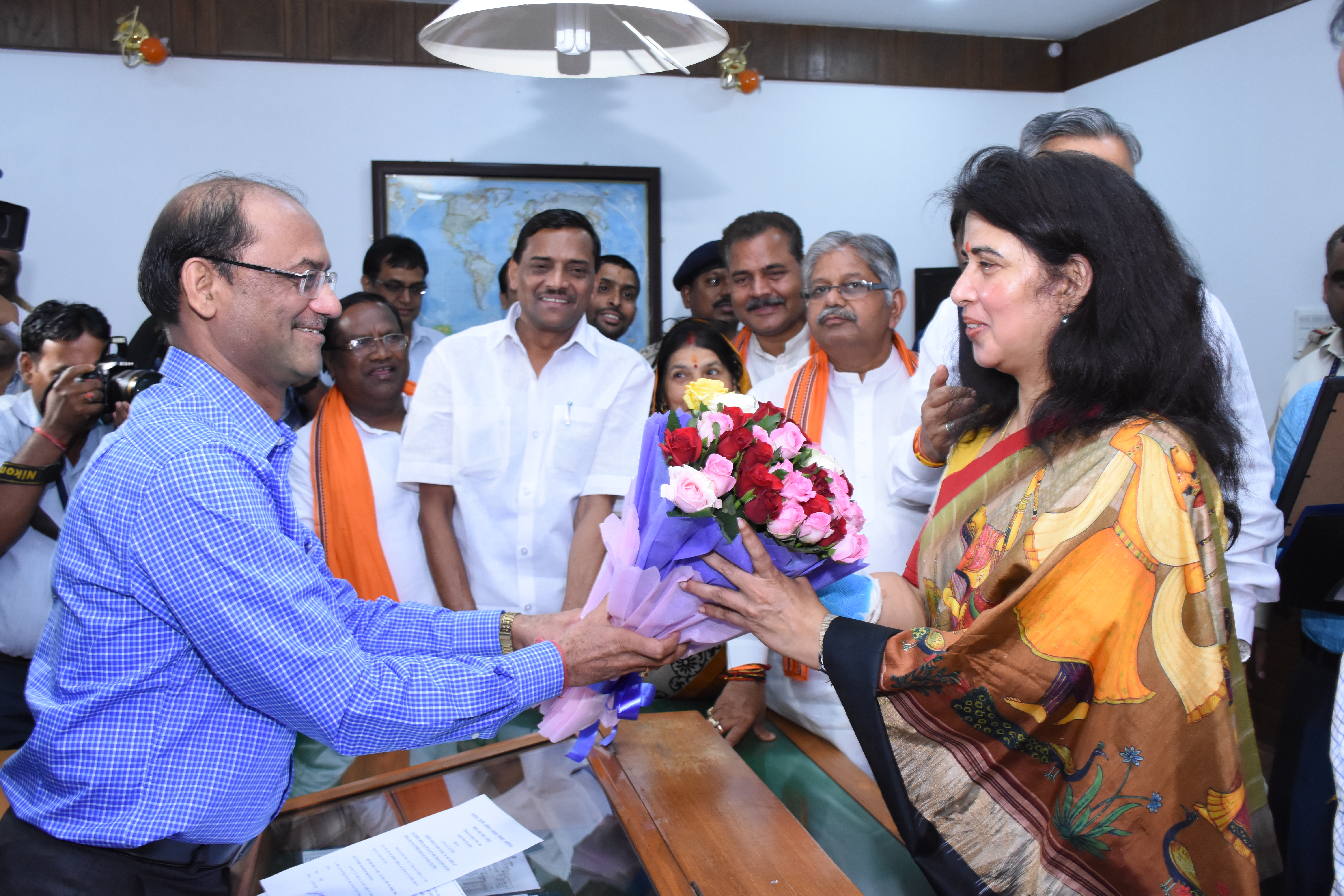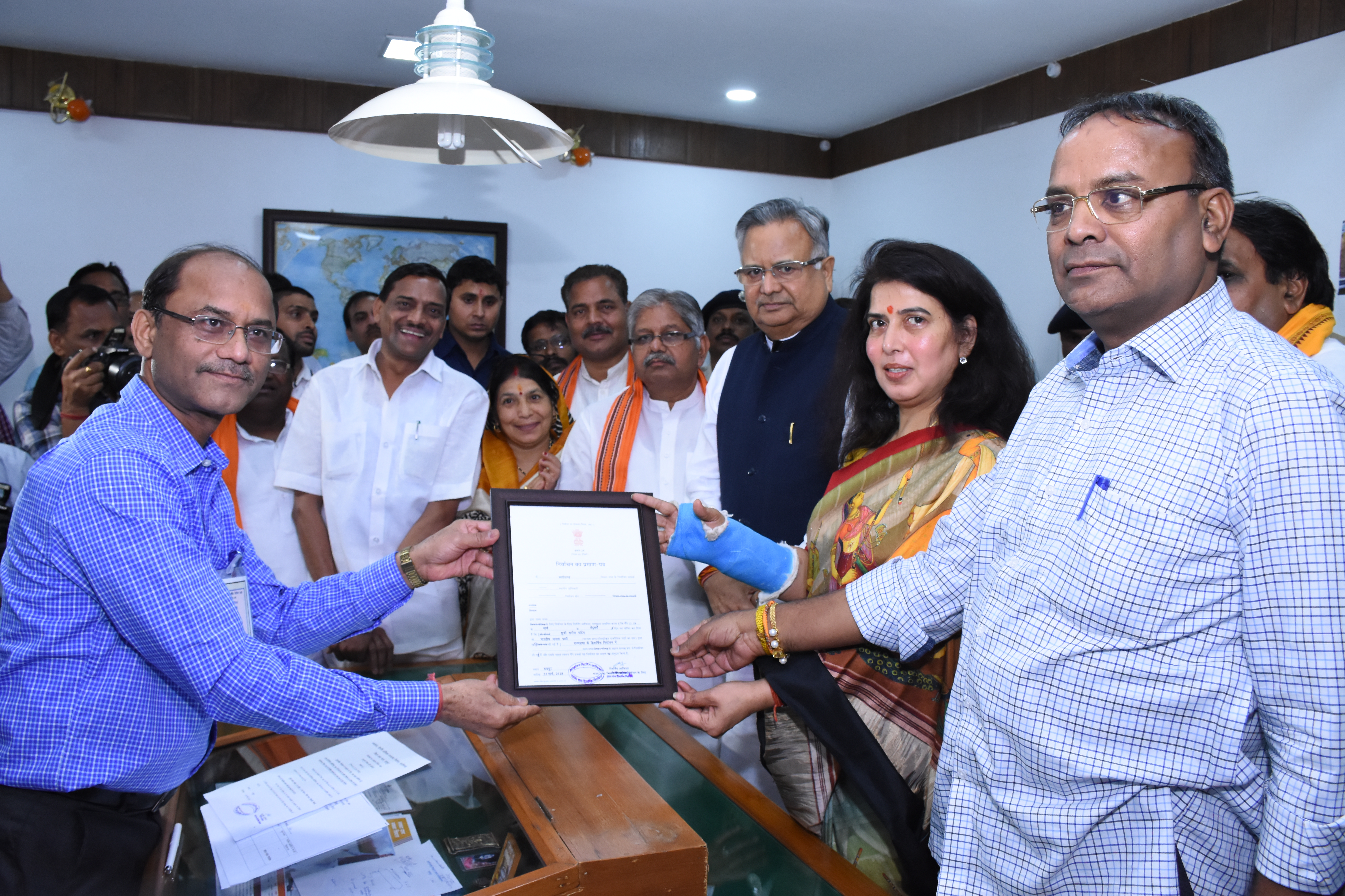 राज्यसभा के द्विवार्षिकी निर्वाचन में सुश्री सरोज पाण्डेय के निर्वाचित होने पर उन्हें रिटर्निंग आफिसर एवं विधानसभा सचिव श्री चन्द्र शेखर गंगराड़े ने प्रमाण पत्र प्रदान किया। विधानसभा सचिव श्री चन्द्र शेखर गंगराड़े ने सुश्री सरोज पाण्डेय को निर्वाचित होने पर उन्हें पुष्प गुच्छ भेंट कर बधाई दी। |