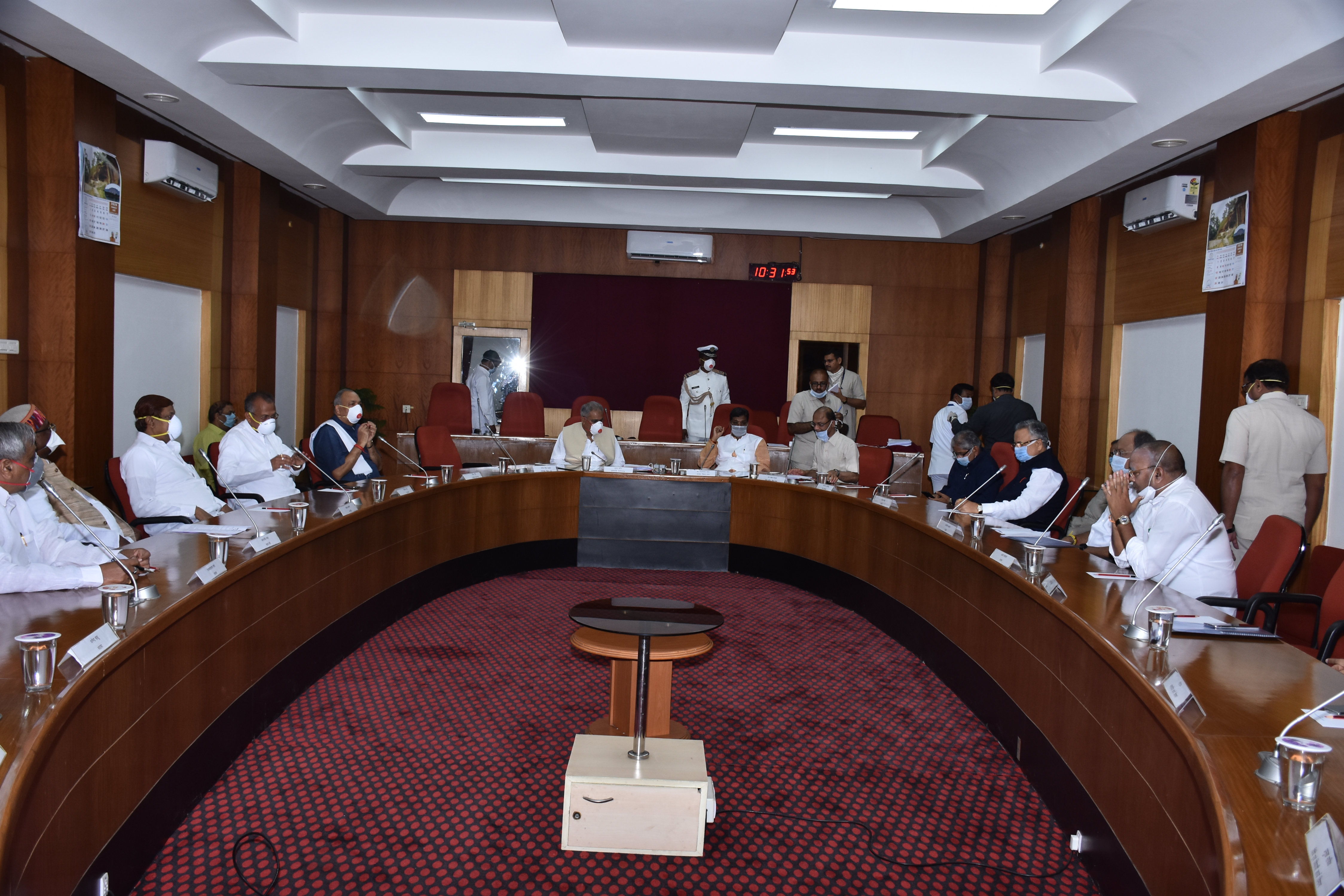 छत्तीसगढ़ विधान सभा की कार्यमंत्रणा समिति की बैठक आज विधान सभा परिसर स्थित मुख्य समिति-कक्ष में विधान सभा अध्यक्ष मान. डा. चरणदास महंत की अध्यक्षता में संपन्न हुई । बैठक में मान. मुख्यमंत्री श्री भूपेश बघेल, मान. नेता प्रतिपक्ष श्री धरमलाल कौशिक, मान. संसदीय कार्यमंत्री श्री रविन्द्र चौबे, मान. लोक निर्माण मंत्री श्री ताम्रध्वज साहू, मान. वन मंत्री श्री मोहम्मद अकबर, मान. खाद्य एवं नागरिक आपूर्ति मंत्री श्री अमरजीत भगत, मान. विधायकगण, मुख्य सचिव, छत्तीसगढ़ शासन, श्री आर.पी. मंडल, विधान सभा के प्रमुख सचिव श्री चन्द्र शेखर गंगराडे़ एवं छत्तीसगढ़ शासन के वरिष्ठ अधिकारी उपस्थित थे । |