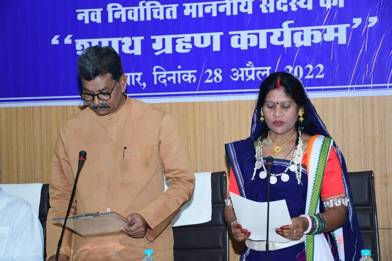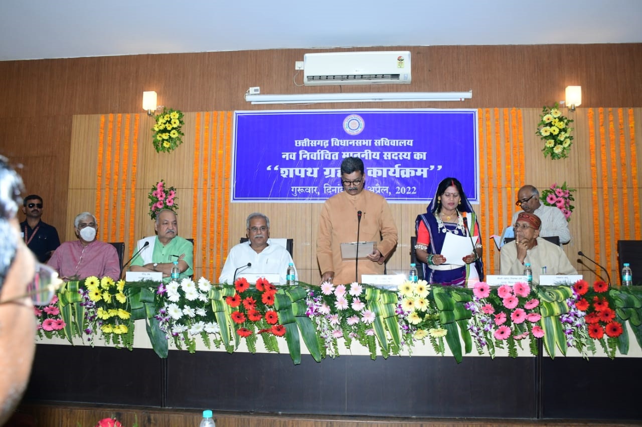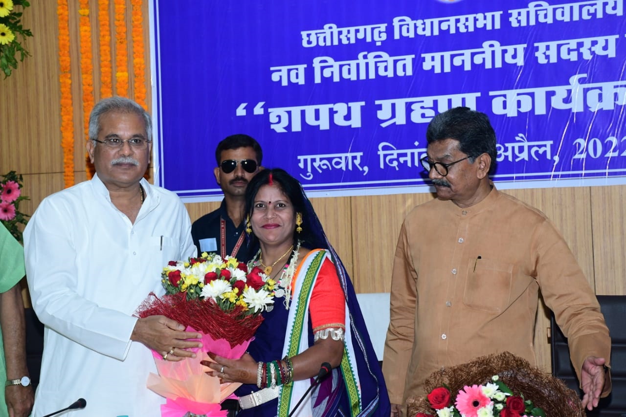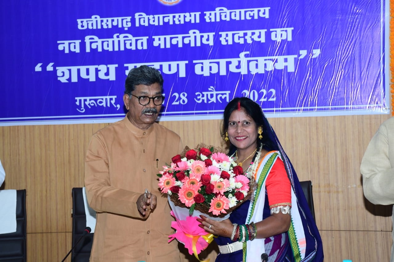 विधान सभा अध्यक्ष डॉ. चरणदास महंत ने खैरागढ़ विधान सभा के नव-निर्वाचित मान. विधायक श्रीमती यशोदा निलाम्बर वर्मा को शपथ दिलाई. |