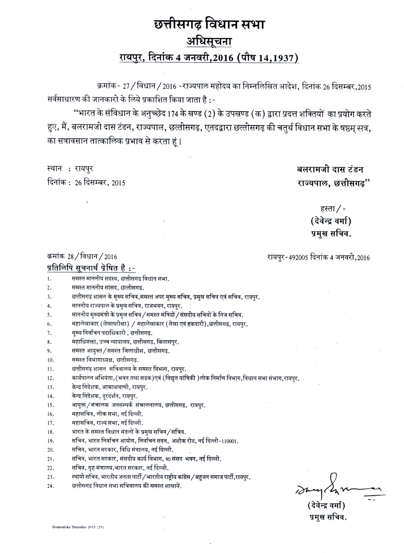 चतुर्थ विधानसभा का षष्ठम् सत्र - दिसम्बर 2015